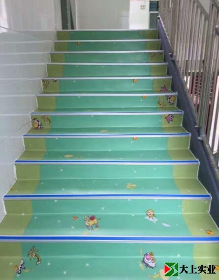 PVC地板可以在幼兒園室內任何一個地方使用,教室、房間、餐廳、衛生間、走廊、臺階等。臺階PVC配上專用防滑條,對小朋友的安全起到很好的保護作用。