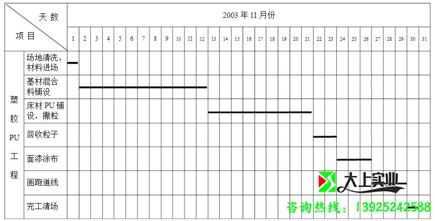 本工程施工面積大,學校要求工期短,為了保證按期完成施工任務,我們在盡可能的條件下,通過合理的計劃安排,力爭在前90天內,高質量的交付給學校使用。(完成內容有,鏟除原有煤渣,做墊層、澆砼、鋪設瀝青砼,安裝給排水噴淋系統,鋪設陽型面層)。