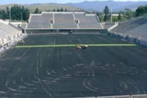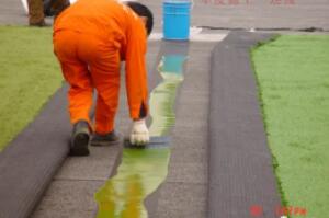 將兩邊草皮對齊拼合,膠粘于接縫布