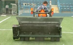 依草高用充砂機充填石英砂、橡膠粒或以人工充填(工具:鐵鍬、填砂機、掃把)