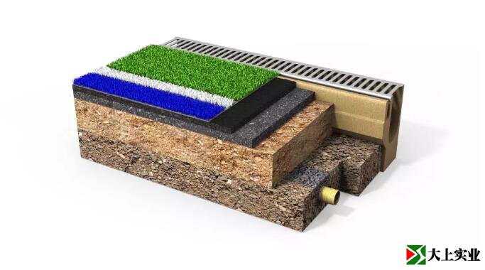 此外,在運動場表層需要設置一個排水口。在端線后面,有3米寬的人造草坪緩沖區,2米寬的空白區,這部分通常是鋪砌地面。在邊線的后面,除了1米的排水區外,建議再增加3米的人造草坪緩沖區。
