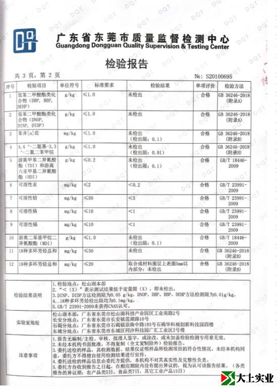 9月28日工程竣工,10月14日把塑膠跑道留樣樣板送廣東省東莞市質量監督檢測中心進行檢測,檢驗結果為符合GB 36246-2018標準要求。