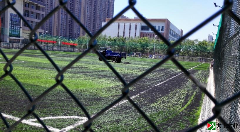 人工草皮都在鋪設了呢!場上是三輪車拖著橡膠顆粒包裝袋在撤橡膠顆粒。